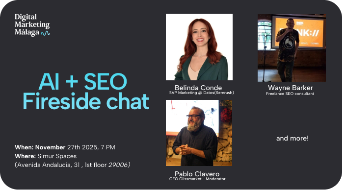 Join us at Simur Spaces (new venue) for a new fireside chat meetup about AI+SEO. We’ll have a Q&A format with 2 special guests: Belinda Conde, SVP Marketing at Datos (a Semrush company) and our very own DMM member and past speaker Wayne Barker, Freelance SEO consultant, which together with Pablo Clavero will start a debate about AI and SEO.