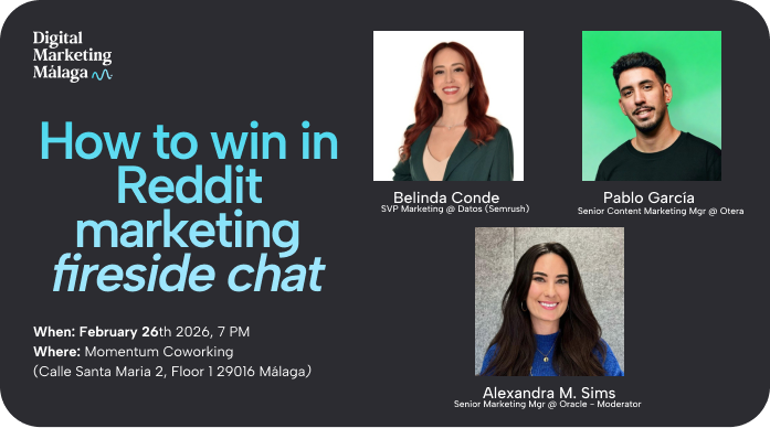 Join us at Momentum Coworking (new venue) for a new fireside chat meetup about Reddit Marketing. We’ll have a Q&A format with 2 special guests: Belinda Conde, SVP Marketing at Datos (a Semrush company) and Pablo Garcia, Senior Content Marketing Manager at Otera. Our very own DMM organizer Alexandra M. Sims, Senior Marketing Manager at Oracle, will act as Moderator.
